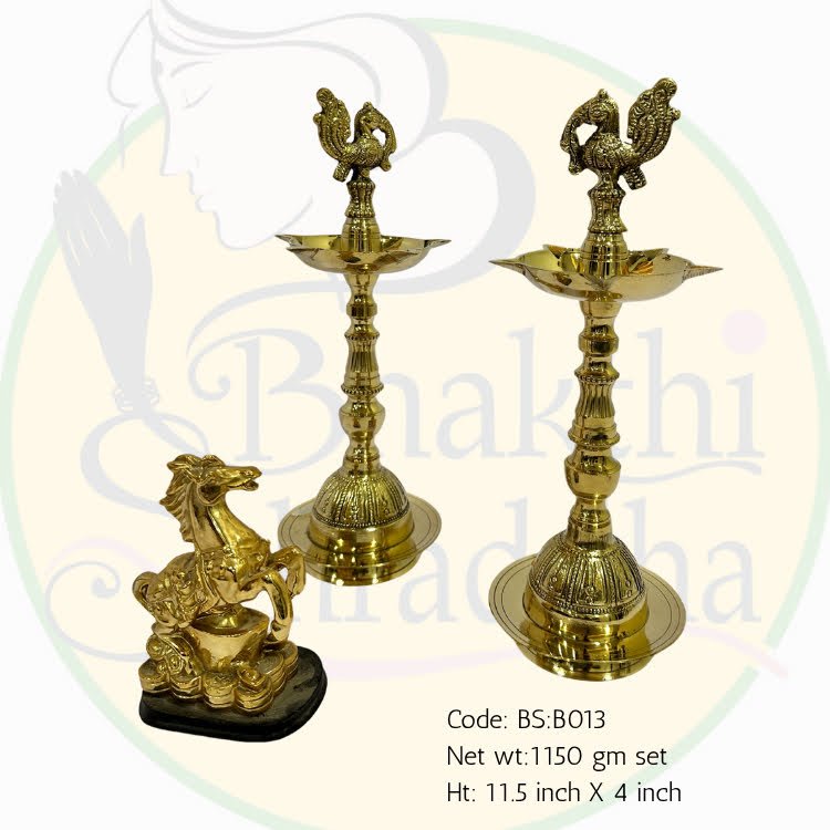 IIlluminate your sacred space with this elegant pair of handcrafted brass peacock deepams (kundhulu), symbolizing purity, prosperity, and divine light. Each lamp features a beautifully sculpted peacock motif on the top, representing grace and auspiciousness in Indian tradition. Made from pure brass with an antique golden finish, these lamps are perfect for daily pooja, festive décor, or gifting on spiritual occasions.