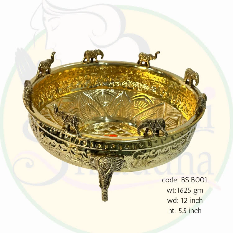 Bring home timeless elegance with this brass urli bowl featuring elephant embellishments. Ideal for floating flowers, diyas, or as a center piece, this urli combines traditional charm with modern aesthetics. A perfect décor piece for Diwali, Navratri, or everyday spiritual ambiance.